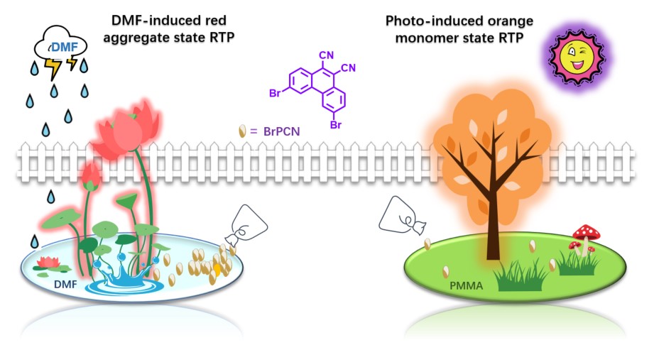 研究成果二:首次开发了在聚集态和单分子状态都具有多重刺激响应性的室温磷光材料。实验结果证明发光中心源于结晶过程中产生的微量客体分子与主体分子形成的团簇。这类多模式刺激响应磷光材料有望成为下一代智能材料,在密码锁和信息加密解密等领域发挥重要的作用。该研究成果以“Multimode stimuli responsive dual-state organic room temperature phosphorescence from a phenanthrene derivative”为题发表于《Chemical Engineering Journal》。