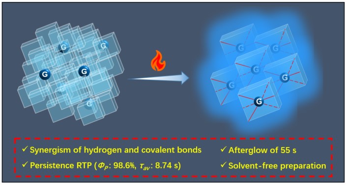研究成果一:设计了以无机硼酸为主体,芳基硼酸或羧酸为客体的主客体室温磷光材料,主客体间氢键和共价键协同作用将有机客体分子牢牢固定,从而实现兼有高效和长寿命的室温磷光。所得材料的磷光量子产率均超过了40%,最高接近100%。平均寿命最长为8.74 s,在紫外灯关闭后,余辉长达55 s。并且该制备方法简单高效、无溶剂,适合工业化生产。该成果以“Nearly Unity Quantum Yield Persistent Room Temperature Phosphorescence from Heavy Atom-Free Rigid Inorganic/Organic Hybrid Frameworks”为题发表在《Angewandte Chemie International Edition》上。