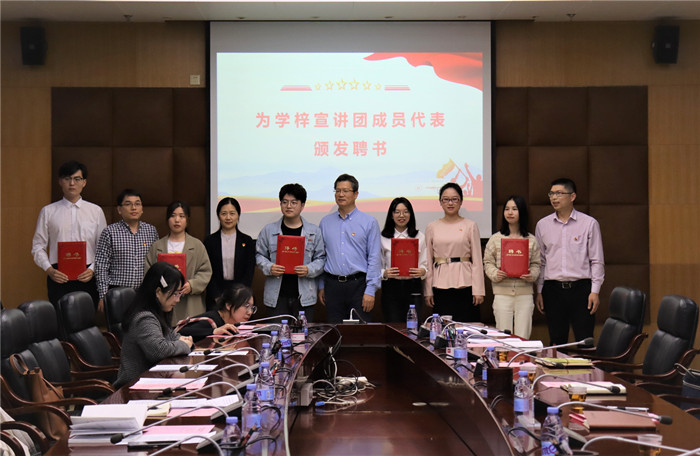 会上,121名同学受聘为学梓宣讲团成员。张爱民为宣讲团授旗,与会领导为宣讲团成员代表颁发聘书。学梓宣讲团团长杨振锐代表团队发言。与会嘉宾与宣讲团成员代表合影留念。