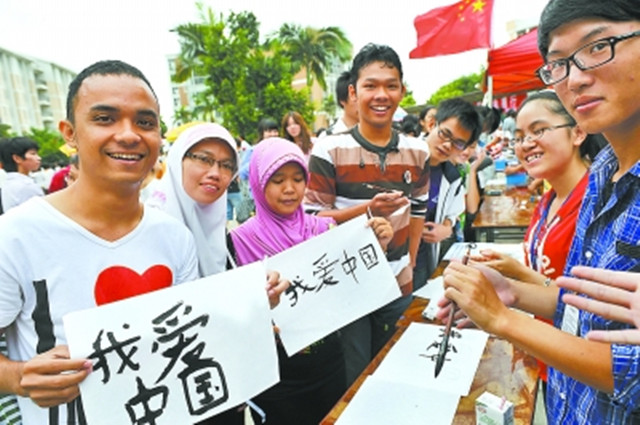 在仓山校区物光学院篮球场前,在旗山校区共青团广场和各学院宿舍楼前,各学院团委、学生会设置的趣味猜谜、杯子金字塔、财富银行、我爱记歌词、平民保龄球等游戏,让同学们乐在其中、笑声不断。许多同学在留言版上写下“祖国我爱你”、“我与祖国共成长”等祝福,充分展现了青年学生欢度国庆的喜悦心情和热爱祖国、祝福祖国的真挚情感。一些来自印尼的留学生用毛笔写下“我爱中国”四个大字,表达对中国的情谊。