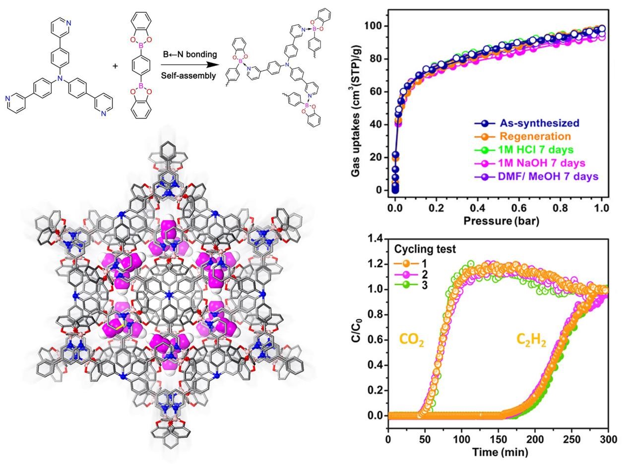 晶态多孔材料由于其广泛的应用前景在近30年来受到越来越广泛的关注。由不同连接节点构筑的晶态多孔材料如金属有机框架、共价有机框架和氢键有机框架由于它们不同的构筑方式展现出各自独特的性能。在该论文中,张章静团队利用配位氮硼键,构筑了首例单晶微孔氮硼有机框架材料BNF-1。BNF-1在除去客体分子后依然保持晶性,并且具有较高的化学稳定性,能够在常温下分离乙炔二氧化碳混合物。该工作不仅代表着九游在线在氮硼框架的研究上取得重要突破,并且为新型晶态多孔材料构筑提供了思路。