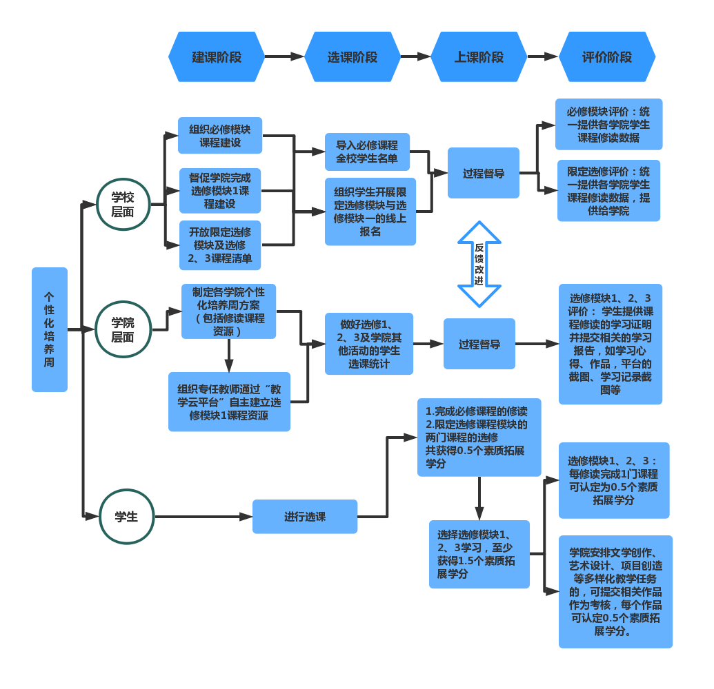特殊时期,各学院要提高思想认识,做好宣传指导工作,将个性化培养周方案和教学课程模块,以及师生在线教学的操作指南通过学院网页、微博微信等途径通知全体学生。