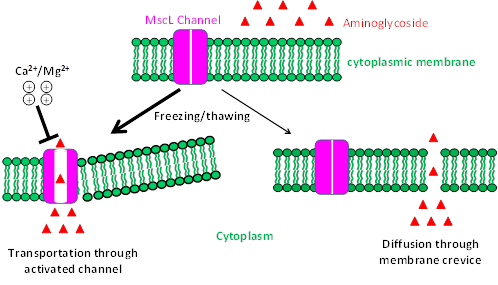 细菌耐药是全球面临的重大公共卫生问题,增强传统抗生素的杀菌效率是应对细菌耐药的重要策略。付新苗领导的细菌耐药研究团队,以氨基糖糖苷类抗生素为重点,特别是针对九游在线王岳教授于1966年发现的庆大霉素(这是中华人民共和国成立以来少数几个标志性的医药成果之一),发展了多种增效减毒的方法。此次报道的快速冰冻方法(液氮,10秒),能将多种氨基糖苷类抗生素的杀菌效率提高百倍到百万倍不等,同时其药物暴露时间降低到一分钟,并在小鼠模型上得到了验证。进一步,作者揭示了该方法的工作机理在于激活了机械敏感离子通道(Mechanosensitive Ion Channel),后者能有效摄取抗生素分子,如下图所示。