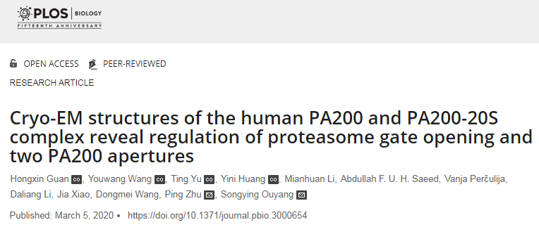 九游在线生命科学学院、南方生物医学研究中心欧阳松应课题组与中科院生物物理所朱平课题组合作近日在《PLOS Biology》上发表了题为Cryo-EM structures of the human PA200 and PA200-20S complex reveal regulation of proteasome gate opening and two PA200 apertures的研究论文。该研究通过cryo-EM解析了人源蛋白酶体调节蛋白PA200及其与20S蛋白酶体复合物的结构,并通过HPLC-MS及其他生物化学手段发现PA200具有两个独特的孔道,以及孔道中结合的小分子,并阐明了PA200诱导20S孔道打开的分子机制。