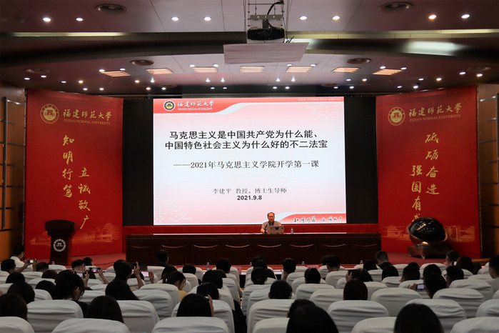 随后,李建平教授以“马克思主义是中国共产党为什么能、中国特色社会主义为什么好的不二法宝”为主题进行授课,引导学生从“马克思主义是中国共产党的灵魂和旗帜,是之所以能的独特优势”“马克思主义是中国特色社会主义的基础和血脉,是之所以好的基因和密码”“马克思主义之所以行,是因为它具有无与伦比的独特理论品格”等三个方面深刻理解“归根到底是因为马克思主义行”的科学论断;李建平教授还讲述了我院的发展历程,深情回顾了他在本学科学习、工作经历,以“风展红旗如画”表达了对我院光明前景的信心,并对同学们提出五点希望:一是德先行,求学先做人,做人德为先;二是强信念,坚定理想信仰,读懂弄通马克思主义理论;三是勤思考,不断提高发现问题、分析问题和解决问题的能力;四是重实践,发扬理论与实践密切结合的优良学风;五是不畏苦,以“天下无难事,只要肯登攀”的精神勤学苦研,争取更多、更好的学术成果。
