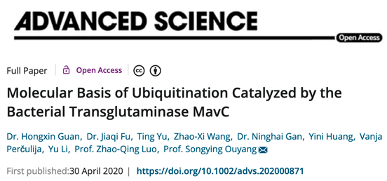 近日,生命科学学院欧阳松应课题组和罗招庆课题组再度合作在《Advanced Science》上发表了题为“Molecular basis of ubiquitination catalyzed by the bacterial transglutaminase MavC”的研究论文。这是该合作团队继2019年7月份在《Nature》、2019年年底在《The EMBO J》以及2020年2月份在《J Biol Chem》上发表军团菌相关研究后的又一重要进展。