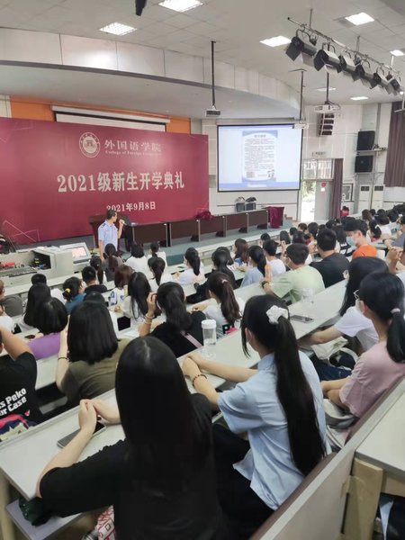 院长葛桂录在开学典礼上为本科新生带来题为“打开一扇门,推开一扇窗;胸怀中国情,放飞中国梦”的开学第一课,寄予新生借外语之器,看广阔世界、为国家发展助力的厚望;与研究生新生分享“语言为文化插上翅膀,学术为思想增添活力”,希望研究生新生能够增强创造意识,提高创新能力,产出科研成果,凭借学术研究释放外语学人的无尽潜力。