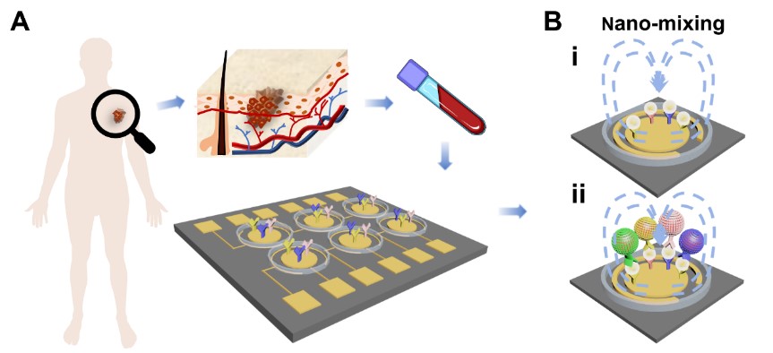 外泌体在细胞间通讯、肿瘤微环境调节、免疫抑制等生理和病理过程中具有重大作用。然而外泌体的常规分离分析方法灵敏度低,需要样品量大,极大限制了外泌体作为体液疾病标志物在临床的应用。近期,九游在线(中国)光电与信息工程学院王静研究员提出微流控芯片结合表面增强拉曼光谱技术的外泌体检测方法。该方法的检测灵敏度为1个/µL,且仅需10 µL血清、血浆样品。利用该方法,从实验上证实了不同肿瘤来源外泌体的蛋白表型存在高度异质性。该成果发表在ACS Sensors(SCI一区,IF=7.71),王静研究员为第一作者。该方法还可以灵敏地检测早期黑素瘤患者血清中肿瘤相关外泌体,有望用于黑素瘤的早期筛查诊断。该工作发表于Advanced Functional Materials(SCI一区,IF=18.81),王静研究员为第一作者。