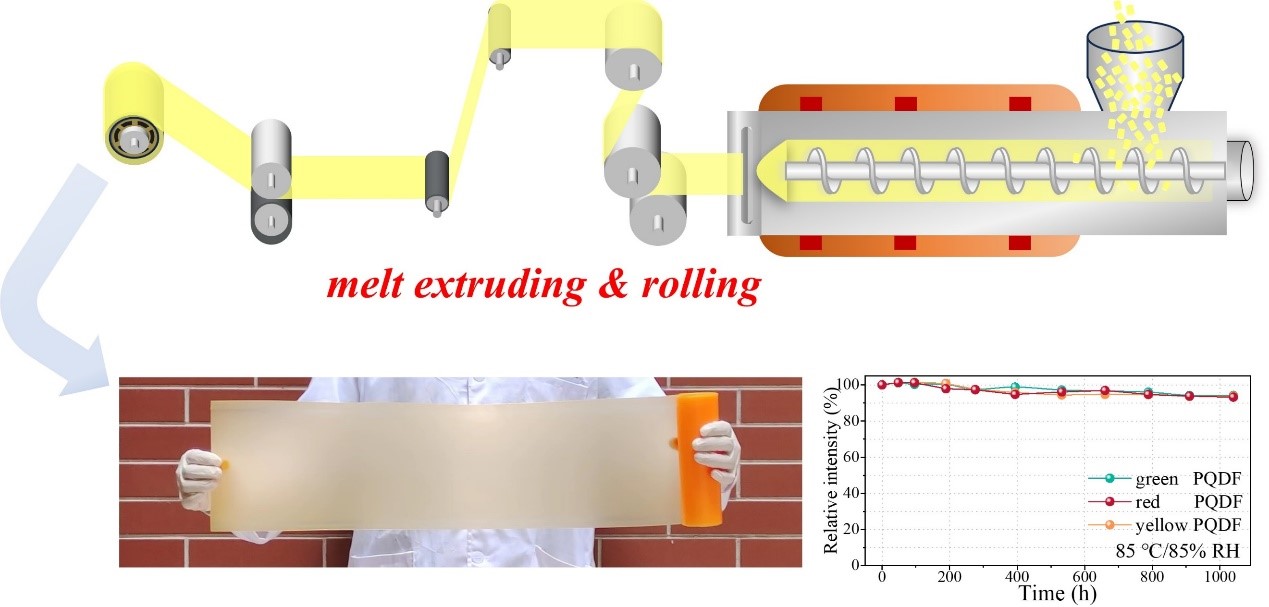 鉴于此,课题组开发了一种易于工业化生产的熔融挤出-压延法制备具有优异光学性能和长期稳定性的大面积单片CsPbX3量子点(X3=Br3, Br1I2)玻璃基黄色PQDF。得益于无机玻璃与聚合物的双重保护,PQDF无需阻隔层保护即可通过超过1000 h的工业老化85 ℃/85% RH测试标准。基于该PQDF所制作的原型显示器得益于量子点高色纯度发射而展示出优异的色彩还原度。该工作提供了一种新颖且可工业化的PQDFs制备技术,并可望实现其在背光显示中的商用应用。