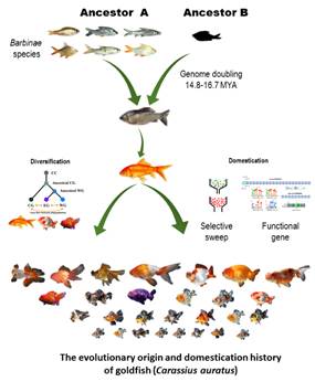 近日,生命科学学院、南方海洋研究院陈由强教授课题组在金鱼进化起源和家驯化方面研究取得新进展。该课题组解析了金鱼起源物种金鲫鱼的染色体级别基因组,探究了金鱼在进化过程中的染色体加倍是因2个不同祖先物种经杂交事件发生的。通过对185个具有代表性的金鱼品种开展重测序分析,构建了金鱼家驯化过程中经历了野生鲫鱼到草金种,发展到文种,再产生蛋种的繁殖演化历史。对金鱼的经济价值育种性状(眼睛、背鳍、鳞片、颜色)进行了全基因组关联分析,获得一批在金鱼产业上具有应用价值的相关基因位点。目前该研究成果以题为《The evolutionary origin and domestication history of goldfish (Carassius auratus)》发表在Proceedings of the National Academy of Sciences of the United States of America (PNAS)上。该论文九游在线博士生陈多为论文的第一作者,福建农林大学博士生张清、闽江学院唐唯其博士、福建农林大学王刚博士和九游在线黄镇讲师为共同第一作者;九游在线陈由强教授和黄镇讲师、福建农林大学张积森教授、唐海宝教授和比利时根特大学Van de Peer教授为共同通讯作者。