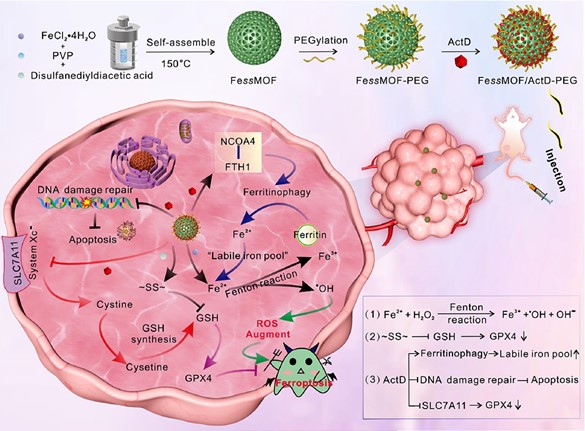 基于团队成员前期在乳腺癌治疗上开展的多个创新性工作的基础上(Adv. Mate. 2019, 31(46): 1905825; Chem. Eng. J. 2023, 452: 138422; 2023, 452: 139517; Adv. Healthcare Mater. 2024: 2304522; 2024, 13(4): 2302537; Int. J. Bio. Macromol. 2024, 258: 128952)九游在线(中国)生命科学学院曾雪梅教师课题组与海峡柔性电子(未来科技)学院燕双仟教授团队联合研发了一种由二硫键和亚铁离子组装而成的铁(II)基金属有机框架(FessMOF)纳米颗粒,用于高效肿瘤铁死亡治疗。制备的FessMOF纳米颗粒表现出过氧化物酶样活性和pH/谷胱甘肽依赖性降解性,这使得肿瘤反应性催化治疗和通过硫醇/二硫交换抑制谷胱甘肽过氧化物酶4的谷胱甘肽消耗治疗成为可能。FessMOF纳米颗粒在聚乙二醇化和负载放线菌素D(ActD)后,得到的FessMOF/ActD-PEG纳米平台可以诱导显著的DNA损伤和脂质过氧化。同时,该团队发现ActD可以抑制Xc-系统并引发铁蛋白自噬,这进一步增强了FessMOF/ActD-PEG的铁死亡治疗效果。此外,体内实验表明,该制备的纳米平台具有良好的生物相容性和高达91.89%的肿瘤抑制率。