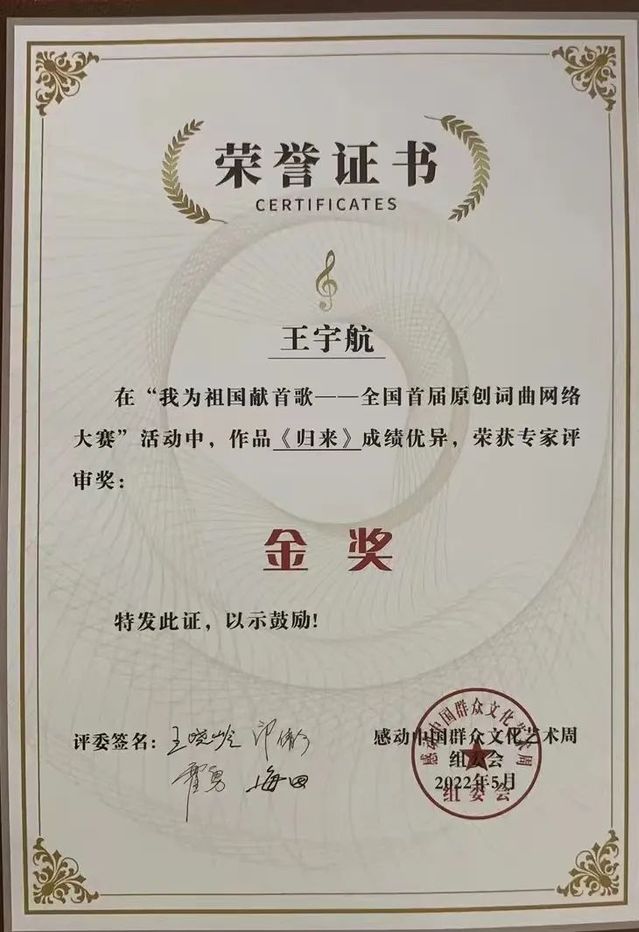 近日,音乐学院教师王宇航作品《归来》在“我为祖国献首歌——全国首届原创词曲网络大赛”活动中荣获金奖。据悉,此次大赛由感动中国群众文化艺术周组委会联合国内众多媒体机构主办,旨在挖掘和展示一批优秀的歌手及词曲创作者,选拔推广一批优秀的原创作品。大赛历时两个月,分为网络初评、专家复评和专家终评。王宇航作品《归来》从近300首原创歌曲中脱颖而出,以专家评审第一名的好成绩摘得桂冠。(音乐学院)