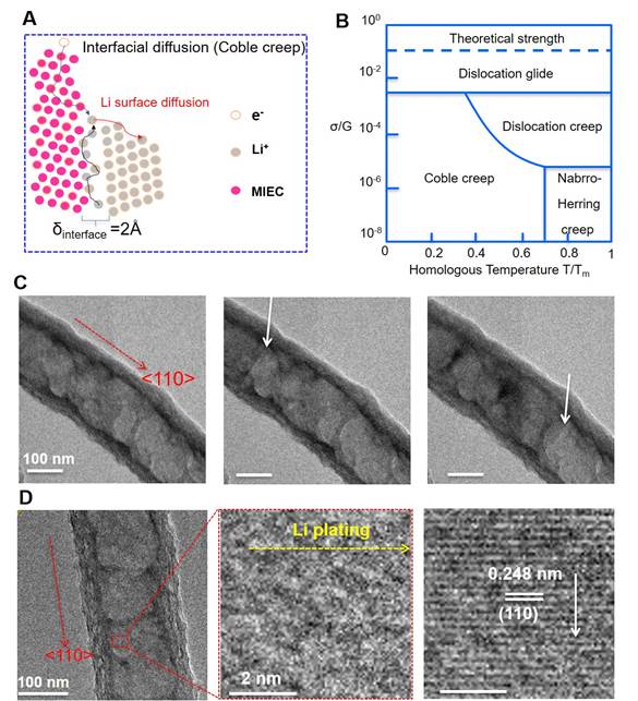为解决上述问题,近期,环境科学与工程学院陈育明/李小燕课题组联合麻省理工学院、得克萨斯州奥斯汀分校、宾夕法尼亚州立大学、悉尼大学等研究者在Nature(综合排第一)和 Chem (环境化学排第一)上面发表了基于蠕变诱导三维全固态锂金属电池等系列工作,研究者报道了一种由电化学稳定的混合锂离子和电子导体(mixed Li-ion and electronic conductor,MIEC)以及电子和锂离子绝缘体(electronic and Li-ion insulator,ELI)组成的三维多孔锂金属宿主来实现的全固态锂金属电池,利用原位透射电子显微镜等手段对金属锂在MIEC管中的沉积-剥离行为进行了研究,发现这些碱金属能够以单晶的形式通过柯勃尔蠕变在MIEC管中进行沉积和剥离。与传统的固态电解质不同,MIEC由于对于金属锂的电化学稳定性好,这种柯勃尔蠕变机制能够显著释放电池内部应力、保持良好的电子和离子接触、可以在长达10μm的尺度下实现可逆的金属锂的沉积剥离长达100次,因此基于柯勃尔蠕变构建的三维全固态锂金属具有优异的循环稳定性。