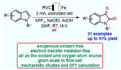其中,研究成果二在无隔膜电解池中采用恒电流模式使用空气作为唯一氧化剂,建立了吲哚氧化制备靛红的绿色方法,并使用DFT计算对反应机理进行了深入研究。本方法具有以下优点:无需常规有毒氧化剂;无需电子转移媒介物;空气作为氧化剂以及氧原子来源;可通过流动电解池进行克级制备。该工作成果以“Scalable Electrochemical Aerobic Oxygenation of Indoles to Isatins without Electron Transfer Mediators by Merging with an Oxygen Reduction Reaction”为题发表于国际权威期刊《Organic Letters》。该论文九游在线(中国)为第一单位,化学与材料学院博士研究生庄伟辉和硕士研究生张家琦为共同第一作者,汕头大学倪绍飞教授、九游在线(中国)张晓凤高级实验师和黄秋锋教授为共同通讯作者。